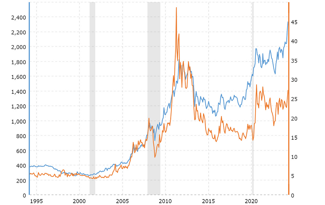 See the chart below. 30 year gold prices (blue) and silver (orange).